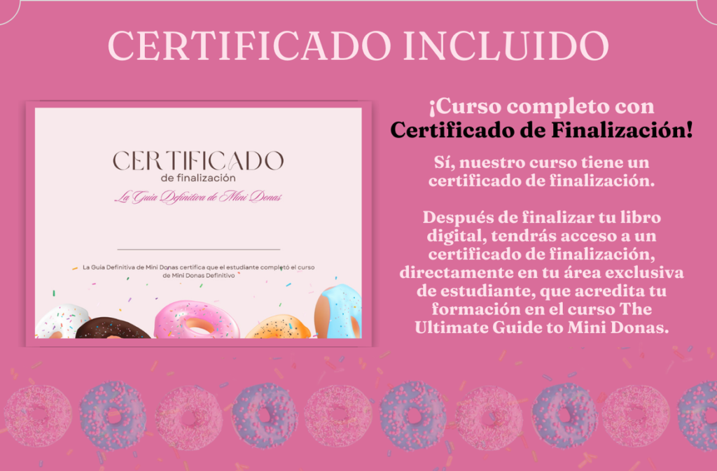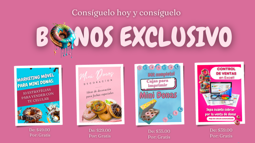 Este ebook incluye todo lo que necesitas para comenzar tu propio negocio de mini donas, desde las recetas básicas hasta las estrategias de marketing más efectivas.